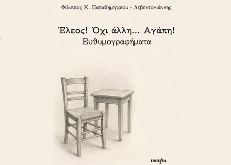 Τριάντα ιστορίες, που διαβάζονται και ως ένα μυθιστόρημα, περιλαμβάνει το νέο βιβλίο του Φίλιππου Κ. Παπαδημητρίου-Λεβεντογιάννη “Έλεος! Όχι άλλη... Αγάπη!”, η παρουσίαση του οποίου θα πραγματοποιηθεί την Τετάρτη 26 Νοεμβρίου, στην αίθουσα του Μουσικοφιλολογικού και Καλλιτεχνικού Ομίλου “Ο Ακρίτας”, η οποία βρίσκεται στο Ιστορικό Κέντρό στην οδό Αιπύτου 11, στις εφτά το απόγευμα…