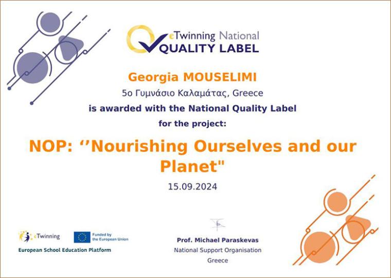 «Με μεγάλη χαρά το 5ο Γυμνάσιο Καλαμάτας ανακοινώνει την απονομή δύο Εθνικών Ετικετών Ποιότητας για τα eTwinning έργα "Let's Debate" και "NOP: Nourishing Ourselves and Our Planet".