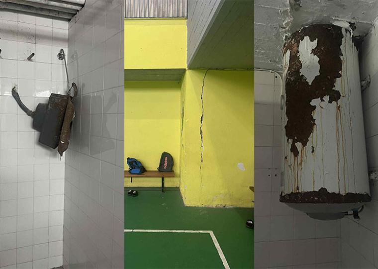 Έδειξε και φωτογραφίες με καζανάκια στις τουαλέτες που κρέμονται και είναι έτοιμα να πλακώσουν όποιον τύχει να βρίσκεται στο σημείο, με ανασφάλιστους ηλεκτρολογικούς πίνακες, με μεγάλες ρωγμές στην τοιχοποιία, με υγραφίες, με σκουριασμένους θερμοσίφωνες, με σπασμένες ντουζιέρες, σπασμένες πόρτες, σπασμένες βρύσες και άλλα που δείχνουν την επικίνδυνη κατάσταση του προπονητηρίου, στο οποίο είπε ο πρόεδρος της Κοινότητας Καλαμάτας ότι αθλούνται οι μαθητές και μαθήτριες αλλά τα απογεύματα και αθλητές και αθλήτριες συλλόγων.