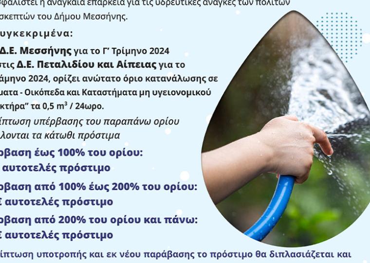 Στην επικοινωνία, σήμερα, το κυρίαρχο στοιχείο για να περάσει ένα μήνυμα, σε ό,τι αφορά την πλειοψηφία του κόσμου, είναι η εικόνα. Έφτιαξε λοιπόν η Δημοτική Επιχείρηση Ύδρευσης Μεσσήνης ένα πόστερ με τα μέτρα για την αντιμετώπιση της λειψυδρίας, αλλά ως φωτογραφία έχει μια βάλει μια ωραία και δροσερή μεν φωτογραφία, η οποία όμως δεν έχει καμία σχέση με το μήνυμα, ότι δηλαδή πρέπει να διακοπεί και όχι απλά να μειωθεί η κατανάλωση νερού ύδρευσης για σκοπούς πέραν των βασικών αναγκών των πολιτών και των νοικοκυριών.