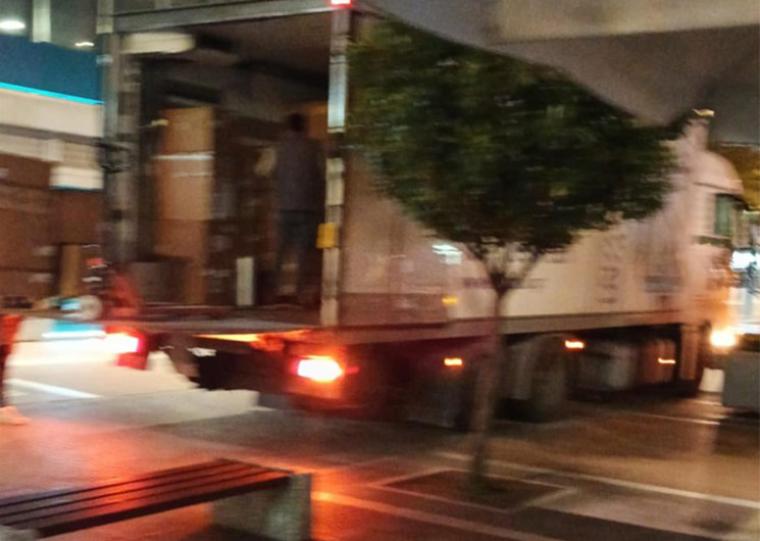 Στην αρχή του πεζόδρομου, μπροστά στην Εθνική Τράπεζα, ήταν ένα φορτηγό, τριαξονικό όπως μας είπε αναγνώστης μας που μας έστειλε τη φωτογραφία, το ξεφόρτωσε μάλλον εμπορεύματα. Λίγο πιο πάνω ήταν ο μεγάλος γερανός, που χρησιμοποιείται για το έργο ζωγραφικής που ολοκληρώνεται στον τοίχο του κτιρίου Παπαδημητρίου.