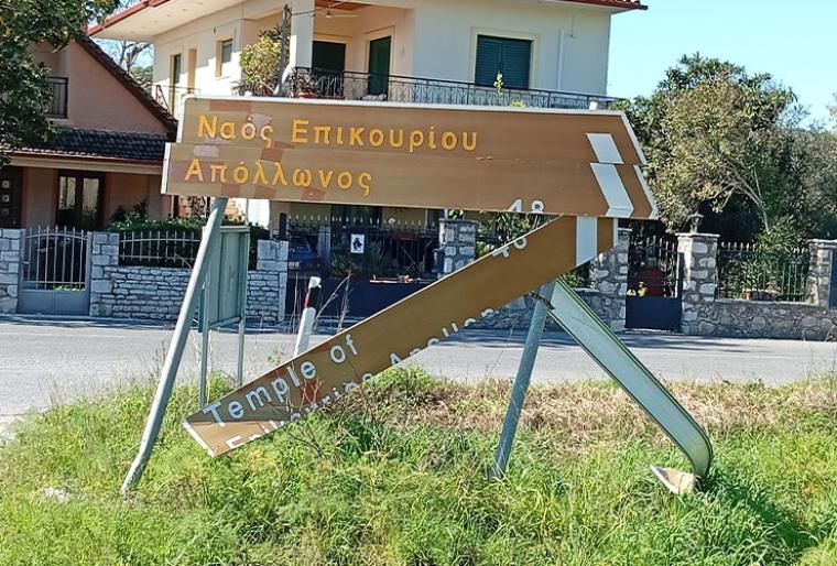 Είναι να μην ντρέπεται κανείς διπλά βλέποντας αυτή την πινακίδα; Η μία ντροπή για την κατάσταση στην οποία έχει περιέλθει η πινακίδα, η δεύτερη ντροπή γιατί πρόκειται για την πινακίδα του Επικούριου Απόλλωνα, του πρώτου από τα μνημεία της Ελλάδας που εντάχθηκε στη λίστα των Μνημείων Παγκόσμιας Πολιτιστικής Κληρονομιάς της UNESCO…