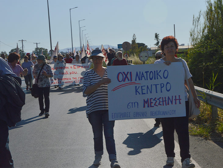 Ο κόσμος που πήγε να διαδηλώσει κατά των πολέμων συγκεντρώθηκε στις 5.30 το απόγευμα στον κόμβο της Μεσσήνης. Από εκεί ξεκίνησε η πορεία με προορισμό το πολεμικό αεροδρόμιο (120 Πτέρυγα Εκπαίδευσης Αέρος), όπου ο κόσμος φώναξε συνθήματα, ενώ ο Αργύρης Σμυρνής επέδωσε το ψήφισμα των Επιτροπών Ειρήνης Πελοποννήσου σε εκπρόσωπο της στρατιωτικής μονάδας. Ακολούθως η πορεία συνεχίστηκε με προορισμό τη Μεσσήνη, ο κόσμος πέρασε γύρω από την πορεία και συγκεντρώθηκε στο τέλος στη μικρή πλατεία, όπου υποδέχτηκε με θερμό χειροκρότημα τους δρομείς που ήρθαν τρέχοντας από την Καλαμάτα. Εκεί έκανε ομιλία ο εκπρόσωπος της Επιτροπής Ειρήνης Μεσσηνίας, Δημήτρης Οικονομάκος, ενώ μια συγκινητική σύντομη αντιπολεμική ιστορία παρουσίασε ο Αργύρης Σμυρνής. Ακόμη έγιναν απαγγελίες ποιημάτων, ενώ ακολούθησε συναυλία.