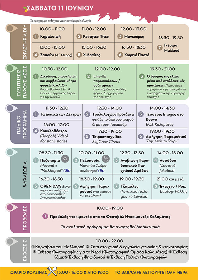 Η έναρξη του Φεστιβάλ θα γίνει στις 8.30 το πρωί του Σαββάτου “με τις πρώτες πεζοπορίες, συνεχίζει από τις 10.00 στο χωριό με πολλές παράλληλες δραστηριότητες (εργαστήρια, συζητήσεις, δρώμενα, μουσικές, αφήγηση παραμυθιού, εκθέσεις, κρυμμένα παιχνίδια κλπ) και κλείνει με τις μουσικές βραδιές των Βασίλη Ράλλη το Σάββατο και Φυστικί Σαλόνι την Κυριακή”.