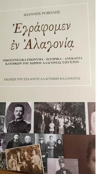 “Πολύτιμο δώρο” χαρακτήρισε η πρόεδρος του Πολιτιστικού Συλλόγου Αλαγονίας, Ελένη Λούρα το βιβλίο, που έχει τίτλο “Εγράφομεν εν Αλαγονία - Οικογενειακά Επώνυμα - Ιστορικά - Ανέκδοτα Κατοίκων του Χωριού Αλαγονίας Ταϋγέτου”, και είπε ένα “μεγάλο ευχαριστώ” προς τον μπάρμπα Γιάννη.