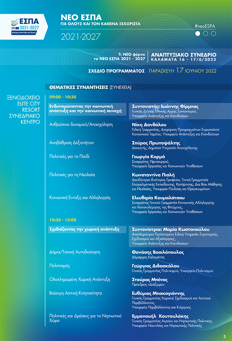 Όπως σημειώνουν οι διοργανωτές του διεθνούς συνεδρίου, “το νέο Εταιρικό Σύμφωνο Περιφερειακής Ανάπτυξης (ΕΣΠΑ) 2021-2027 εγκρίθηκε στις 29 Ιουλίου 2021 από την Ευρωπαϊκή Επιτροπή, πρώτο μεταξύ όλων των Κρατών Μελών. Ακολούθησε η επίσημη υποβολή των νέων τομεακών και περιφερειακών προγραμμάτων, η έγκριση των οποίων βρίσκεται πλέον σε τελικό στάδιο, μετά από εκτεταμένη διαβούλευση με τις υπηρεσίες της Ευρωπαϊκής Επιτροπής, και αναμένονται οι εγκρίσεις των πρώτων προγραμμάτων τις αμέσως επόμενες εβδομάδες. Το συνολικό ύψος των διαθέσιμων πόρων που θα διοχετευθούν στην ελληνική οικονομία και κοινωνία μέσω του ΕΣΠΑ 2021-2027, ανέρχεται σε 26,2 δισ Ευρώ, εκ των οποίων 20,9 δισ Ευρώ αποτελούν την ενωσιακή συνδρομή και 5,3 δισ Ευρώ την εθνική συμμετοχή. Στο νέο ΕΣΠΑ περιλαμβάνονται σημαντικές καινοτομίες, όπως αυτή της απλοποίησης των διαδικασιών προσκλήσεων, αξιολόγησης και εκταμίευσης ενισχύσεων προς τις επιχειρήσεις, αλλά και αυτής της χρηματοδότησης δράσεων για την διοικητική και διαχειριστική ικανότητα των φορέων ωρίμανσης και υλοποίησης έργων (capacity building), την δημιουργία νέου διακριτού Προγράμματος για την πολιτική προστασία, τον ψηφιακό μετασχηματισμό, την δίκαιη αναπτυξιακή μετάβαση, την σημαντική ενίσχυση των διαθέσιμων πόρων των περιφερειακών Προγραμμάτων.Το νέο ΕΣΠΑ αναμένεται να συμβάλει στον παραγωγικό μετασχηματισμό της οικονομίας, την ενίσχυση της κοινωνικής συνοχής και τον περιορισμό των περιφερειακών ανισοτήτων. Με νέες δράσεις και έργα για την προώθηση της καινοτομικής και εξωστρεφούς επιχειρηματικότητας, την αναβάθμιση και ανάπτυξη υποδομών μεταφορών, τον περιορισμό των επιπτώσεων της κλιματικής αλλαγής, την ορθολογική διαχείριση των υδάτων, την προστασία της βιοποικιλότητας, την «καθαρή» ενέργεια, την απασχόληση και την αναβάθμιση των δεξιοτήτων του ανθρώπινου δυναμικού, την ένταξη των ευάλωτων κοινωνικών ομάδων, την υγεία και την ψυχική υγεία, την ποιοτική εκπαίδευση των νέων, την ολοκληρωμένη χωρική ανάπτυξη”.