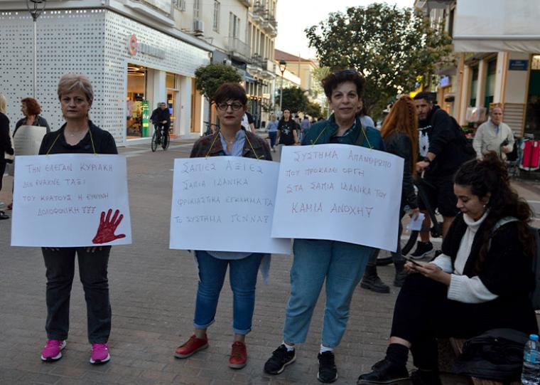 “Σάπιες αξίες, σάπια ιδανικά, φρικιαστικά εγκλήματα το Σύστημα γεννά” έγραφε το πλακάτ που κρατούσε η πρόεδρος του Συλλόγου για τα Δικαιώματα της Γυναίκας Καλαμάτας (μέλος της Ομοσπονδίας Γυναικών Ελλάδας), Αγγελική Ρηγανάκου, στην παράσταση διαμαρτυρίας που πραγματοποιήθηκε χθες, Παρασκευή, το απόγευμα, στον πεζόδρομο της Αριστομένους, κάτω από το παλιό Δημαρχείο, για τη δολοφονία της 28ης στους Αγίους Αναργύρους, έξω από το Αστυνομικό Τμήμα και ενώ ζητούσε την προστασία της Αστυνομίας…