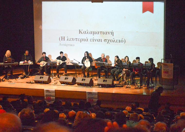 Η εκδήλωση ολοκληρώθηκε με το τραγούδι “ Όπως και να 'ναι τούτη η γη / θα 'μαι στην πρώτη τη γραμμή, / όπως και τώρα, τώρα-τώρα / που είναι δίσεκτοι οι καιροί” (Μουσική/Στίχοι: Llach Lluis/Φαλάρας Πάνος) και με νέες της ΚΝΕ να ανεμίζουν τις σημαίες του ΚΚΕ.