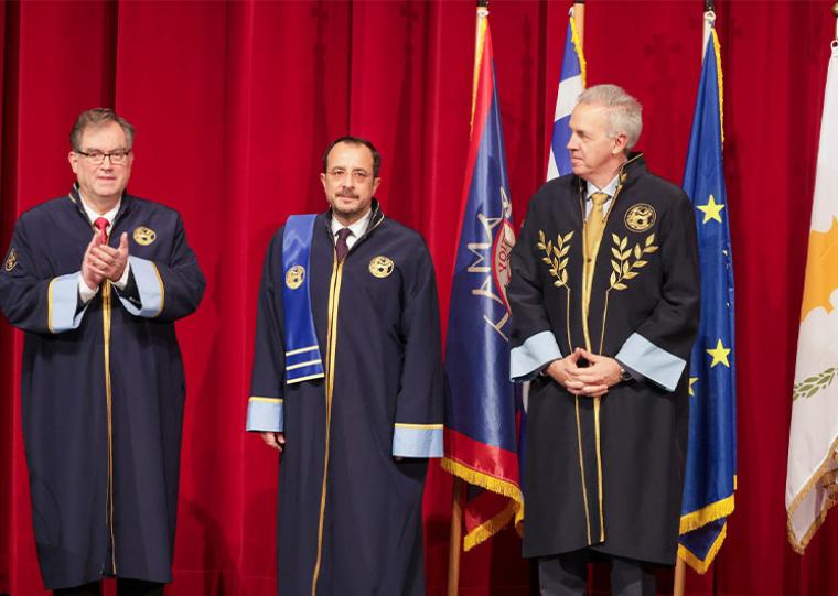Κατά τη διάρκεια της τελετής αναγόρευσης, ο Πρύτανης του Πανεπιστημίου Πελοποννήσου Καθηγητής Αθανάσιος Κατσή αναφέρθηκε στο σημαντικό έργο που έχει στο ενεργητικό του ο Πρόεδρος της Δημοκρατίας. Επεσήμανε επίσης τον μεγάλο αριθμό των Κυπρίων φοιτητών που φοίτησαν στο Πανεπιστήμιο Πελοποννήσου και τόνισε ότι «προσδοκούμε σε περαιτέρω συνεργασία και εμβάθυνση μεταξύ των Πανεπιστημίων της Κύπρου και του Πανεπιστημίου Πελοποννήσου».