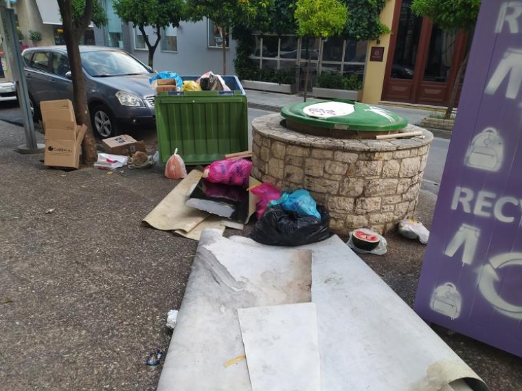 Κανένας κάδος σε ολόκληρη την Αριστοδήμου από τη Βασ.Γεωργίου μέχρι τη Βασ.Αμαλίας