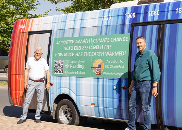 Την απάντηση την δίνει το ίδιο το λεωφορείο το οποίο έχει ντυθεί με τις “λωρίδες ή γραμμές θέρμανσης” και ουσιαστικά οπτικοποιεί δεδομένα του κλίματος. Πιο συγκεκριμένα, κάθε λωρίδα αντιπροσωπεύει τη μέση θερμοκρασία για ένα μόνο έτος, σε σχέση με τη μέση θερμοκρασία κατά την περίοδο από το 1961 έως το 2010. Οι αποχρώσεις του μπλε υποδεικνύουν χρονιές ψυχρότερες από τον μέσο όρο, ενώ οι αποχρώσεις του κόκκινου, χρονιές θερμότερες από τον μέσο όρο. Οι έντονες με τις βαθιές κόκκινες σε χρώμα λωρίδες, όσο κινούμαστε στο πίσω μέρος του λεωφορείου, καθώς και το έντονο κόκκινο χρώμα στη πίσω όψη του, που αντιστοιχεί χρονολογικά στο έτος 2024, δείχνουν την ταχεία θέρμανση του πλανήτη μας τις τελευταίες δεκαετίες. Μ’ αυτό τον τρόπο φαίνεται ξεκάθαρα και με χαρακτηριστικό έντονο τρόπο, το πως οι μέσες παγκόσμιες θερμοκρασίες έχουν αυξηθεί σε διάστημα σχεδόν δύο αιώνων. Το συγκεκριμένο γραφικό σχέδιο το έχει δημιουργήσει ο καθηγητής στο Αγγλικό Πανεπιστήμιο του Reading, κ. Ed Hawkings. Σκανάροντας το QRcode που βρίσκεται πάνω στο λεωφορείο ή αν επισκεφτείτε την ιστοσελίδα https://showyourstripes.info/ μπορείτε να αντλήσετε περισσότερες πληροφορίες.