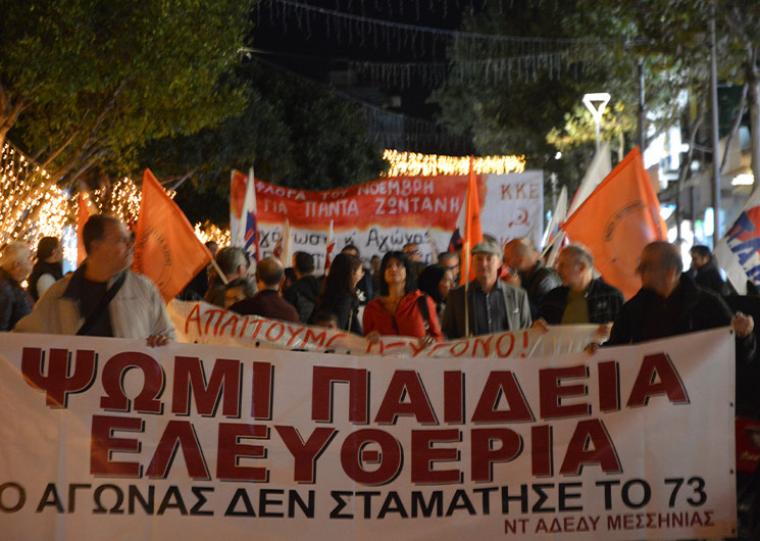 Στην κεντρική πλατεία μίλησαν ο Παναγιώτης Καράμπελας, από το Συνδικάτο Οικοδόμων και Συναφών Επαγγελμάτων, η Μαρία Φράγκου από την Ένωση Γονέων και η Χριστίνα Λαδά από το Σύλλογος Εκπαιδευτικών Πρωτοβάθμιας Εκπαίδευσης Μεσσηνίας.