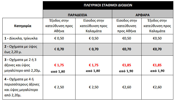 Ο νέος τιμοκατάλογος περιλαμβάνει ΦΠΑ 23% και θα ισχύει για όλους τους μετακινούμενους, συμπεριλαμβανομένων των κατόχων ηλεκτρονικών πομποδεκτών".