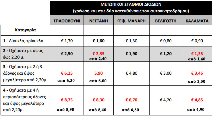 Από την προαναφερθείσα τιμαριθμική αναπροσαρμογή προκύπτουν μειώσεις τιμών σε ορισμένους σταθμούς διοδίων και σε ορισμένες κατηγορίες οχημάτων, οι οποίες απεικονίζονται με κόκκινο χρώμα στους παρακάτω πίνακες. Οι υπόλοιπες τιμές (με μαύρο χρώμα) δεν επηρεάζονται και παραμένουν ίδιες με αυτές του 2015: