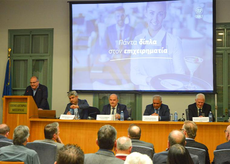 Η εκδήλωση άνοιξε από τον πρόεδρο του Συλλόγου Καταστημάτων Εστίασης και Αναψυχής Καλαμάτας, Νίκο Μαλαπέτσα, ακολούθησε χαιρετισμός από τον πρόεδρο της Ομοσπονδίας Επαγγελματικών, Βιοτεχνικών και Εμπορικών Σωματείων, Γιώργο Καπερώνη, τον βουλευτή Περικλή Μαντά, το δήμαρχο Καλαμάτας και επίτιμο πρόεδρο της Ομοσπονδίας, όπως επίσης επίτιμο μέλος του ΔΣ της ΓΣΕΒΕΕ Θανάση Βασιλόπουλο και τον πρόεδρο του Επιμελητηρίου, Βαγγέλη Ξυγκώρο.